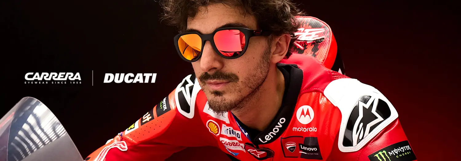 Особая глава — коллаборация CARRERA x DUCATI. Здесь спортивная аэродинамика встречается с эргономикой мотошлема: изогнутые заушники с антискользящими вставками, точные углы посадки, лёгкие, но жёсткие мосты и фирменные красные акценты Ducati. Такие модели созданы для высоких скоростей и активного лайфстайла: не давят под шлемом, не сползают и сохраняют стабильную видимость даже при вибрациях и встречном потоке воздуха.